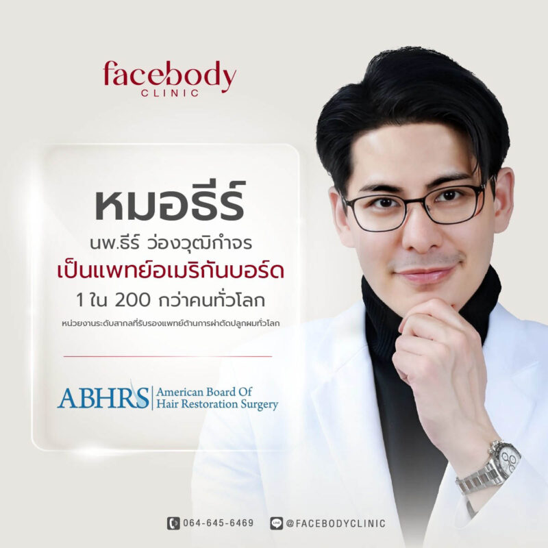 หมอธีร์” นพ.ธีร์ ว่องวุฒิกำจร หนึ่งในแพทย์ไม่กี่คนทั่วโลกที่ได้รับวุฒิบัตรจาก American Board of Hair Restoration Surgery (ABHRS) หน่วยงานระดับสากลที่รับรองมาตรฐานการปลูกผมที่เข้มงวดที่สุด เพื่อผลลัพธ์และความปลอดภัยสูงสุดของคนไข้ทุกเคส