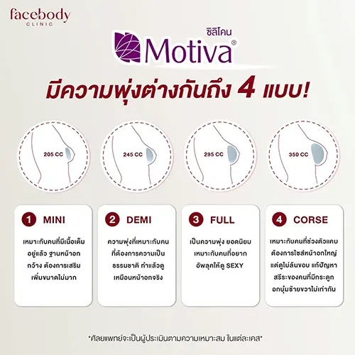 แบรนด์ที่มีความปลอดภัยสูง Motiva รุ่นที่นิยมมีหลายรุ่น เช่น Implants รุ่นนี้เป็นซิลิโคนผิวนาโนกำมะหยี่ยืดหยุ่นดี รองรับแรงดึงได้ถึง 270%, รุ่น Silk Surface Plus มีความดึงดูดสายตาเหมือนหน้าอกสาววัยรุ่น, รุ่น Ergonomix มีความพิเศษที่ตัวชิพเก็บข้อมูลการผ่าตัดเพื่อให้สามารถสืบค้นประวัติการผ่าตัดทำ ศัลยกรรมหน้าอก ในกรณีที่จำเป็นต้องใช้ข้อมูลนี้ในอนาคต