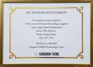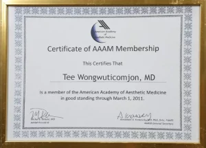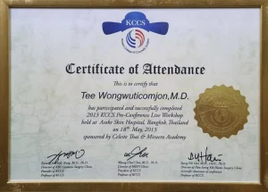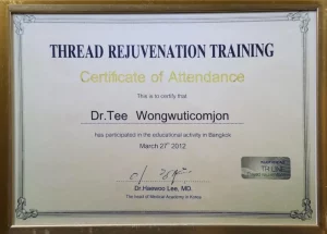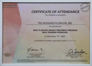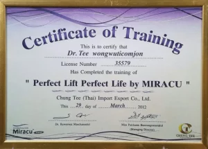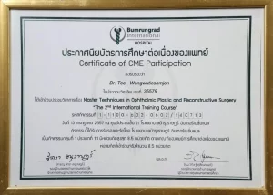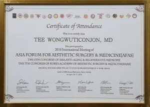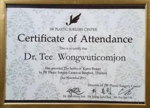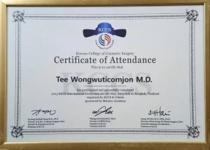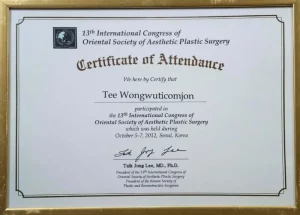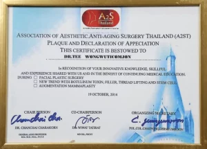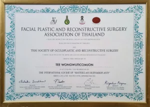 National Certification: Certified in Facial Cosmetic Surgery, as well as Breast Augmentation and Liposuction, by the Cosmetic Surgery and Medicine Association of Thailand.