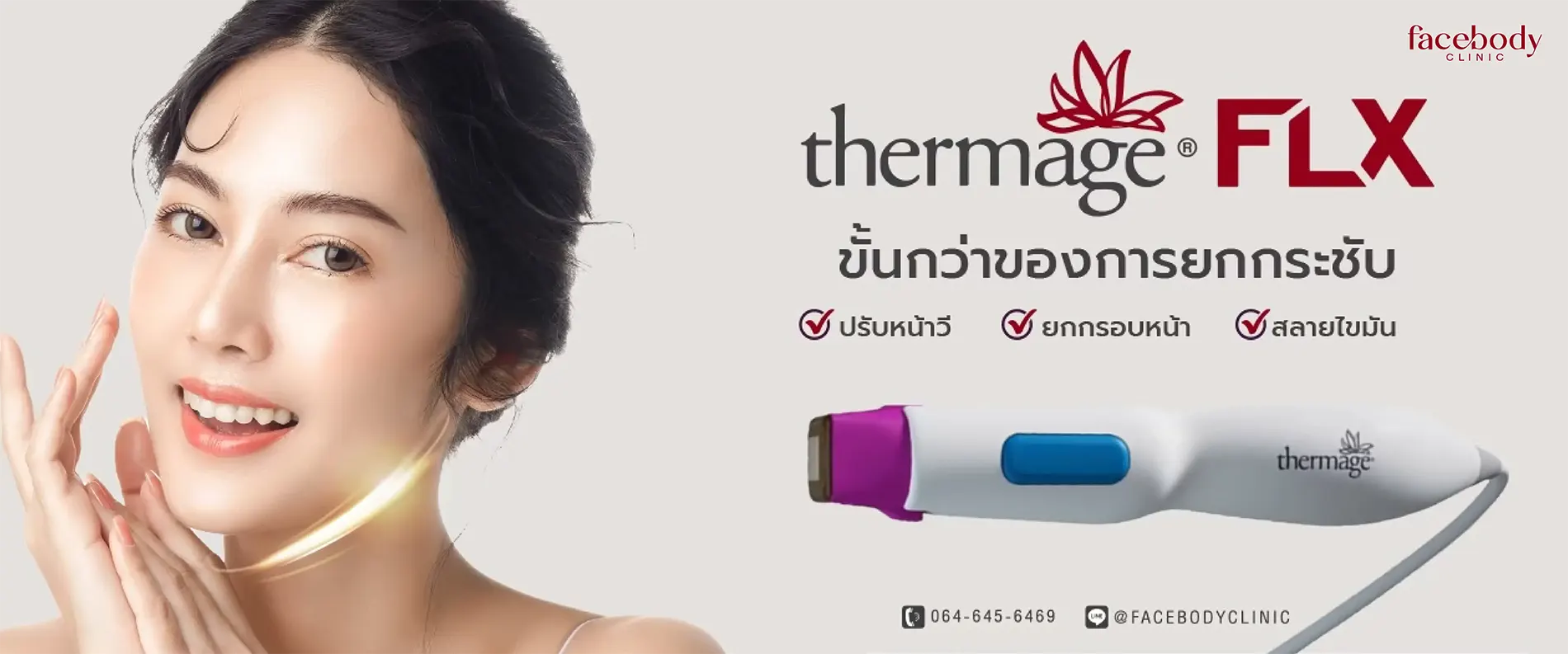 โดย THERMAGE FLX เป็นเครื่องรุ่นใหม่ที่พัฒนาขึ้นในปี 2018 โดดเด่นเรื่องความแม่นยำ การแสดงผลการทำแบบเรียลไทม์ หัวฉีดสามารถปล่อยพลังงานขนาดใหญ่กว่าเครื่องรุ่นเดิม จึงใช้จำนวน Shot น้อยกว่า และเวลาในการทำน้อยลง 25% นอกจากนั้นที่หัวฉีดยังมีระบบ Integrated Cooling ปล่อยความเย็นร่วมกับระบบสั่นช่วยป้องกันการไหม้ของผิวหนังชั้นนอก ทำให้เจ็บน้อยลงและรู้สึกผ่อนคลายมากขึ้น